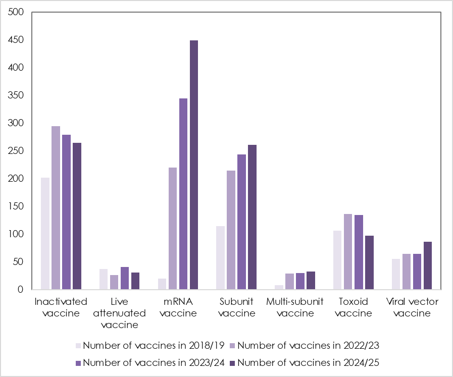 * Year end 30 June 2024. Figures are based on international vaccine patent applications published under the Patent Cooperation Treaty (PCT) during the 12 months to June 2019, 2023, 2024 and 2025, classified by type: inactivated (264), live attenuated (31), mRNA (449), subunit (261), multi-subunit (32), toxoid (97), viral vector (86).